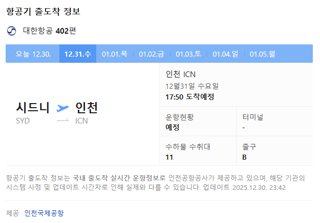 12월 31일(수) 오후 17시 50분 대한항공 KE402편으로 인천국제공항으로 국내도착후